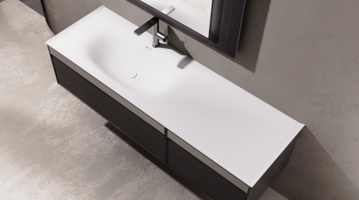 The countertop shines with a bright yet soft luster and boasts a fine texture. Compression and bending resistant, it’s durable and wear-proof. The one-piece molding ensures easy cleaning, keeping it as good as new for long.