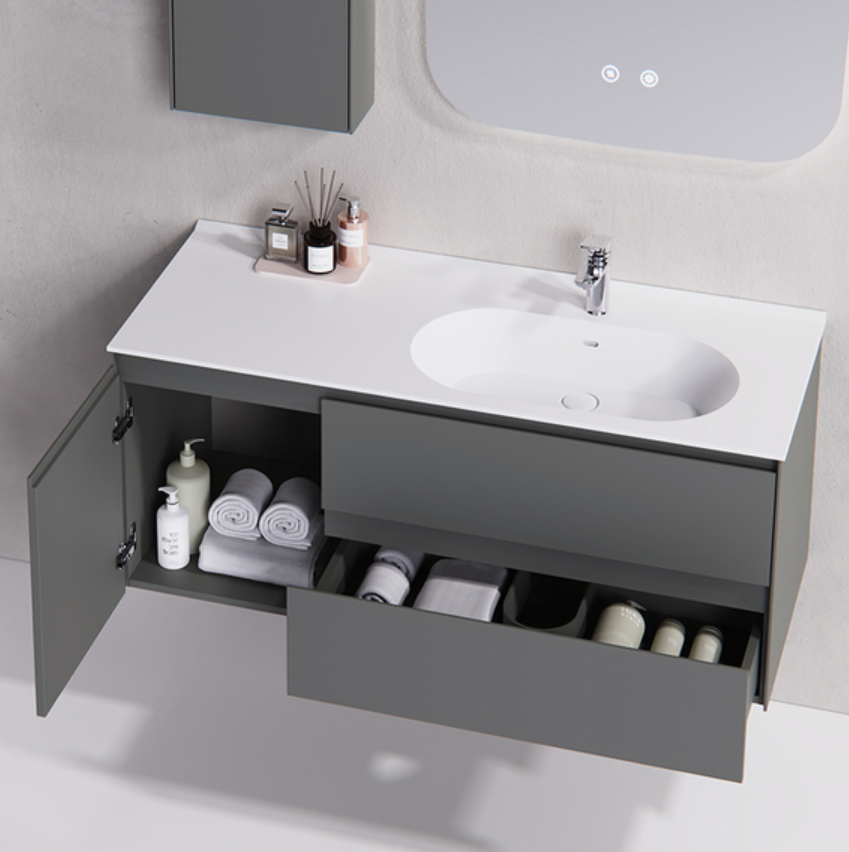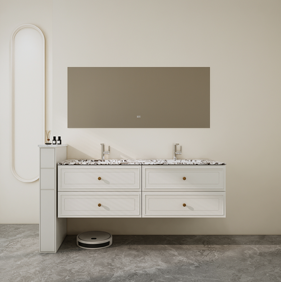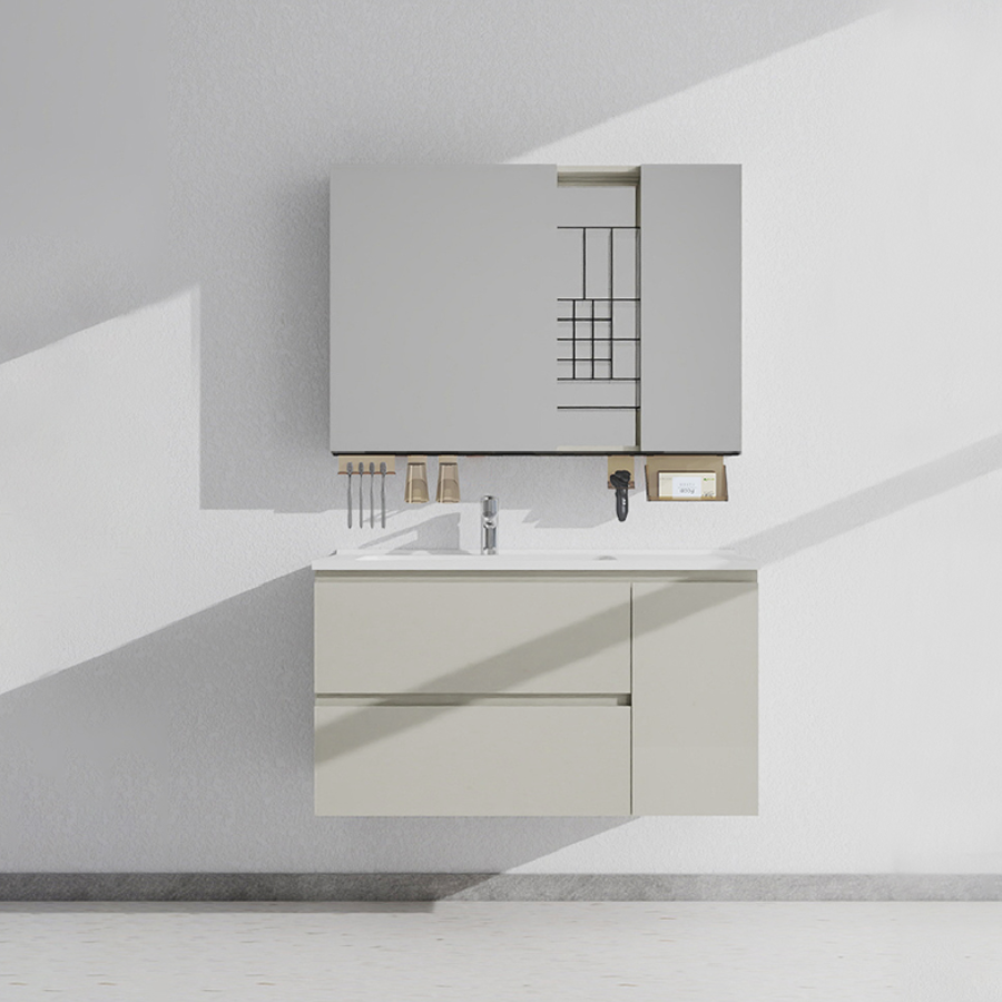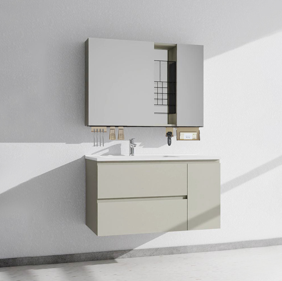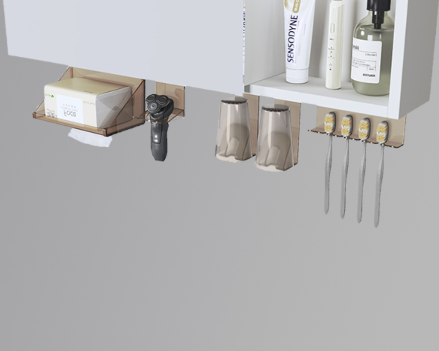 Super storage capacity of the mirror cabinet, combined with a new integrated storage rack—stylish and sleek, with dedicated areas for different items. It features a smooth push-pull design for free movement, easy installation, and keeps your belongings organized.