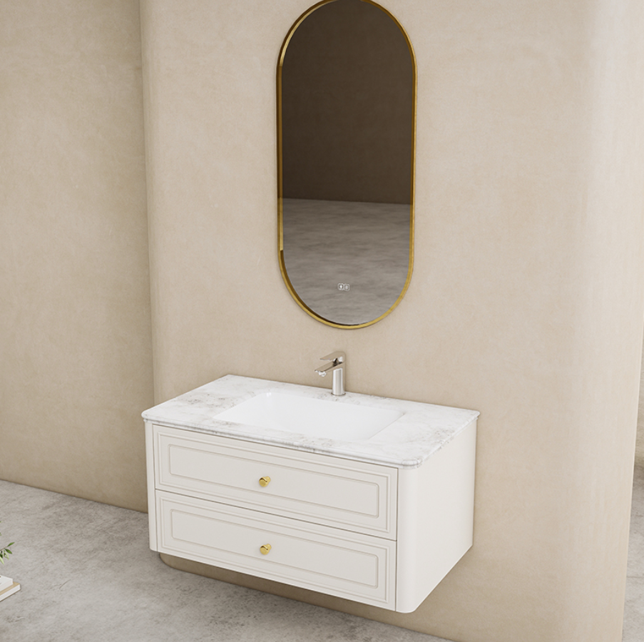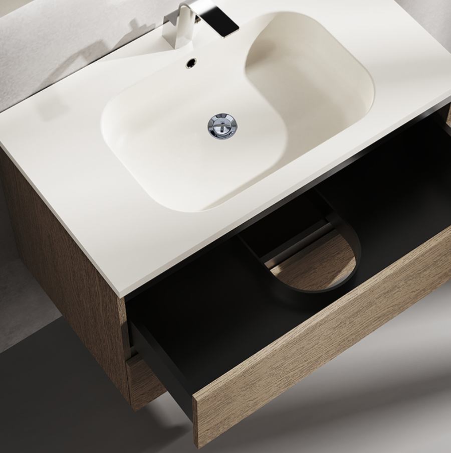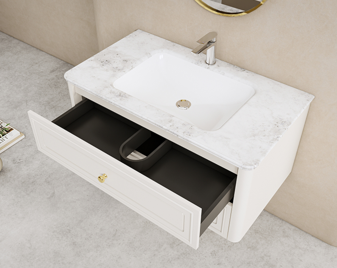 The countertop’s rounded-edge design prioritizes safety and peace of mind, adding a touch of warmth and elegance to your bathroom space.